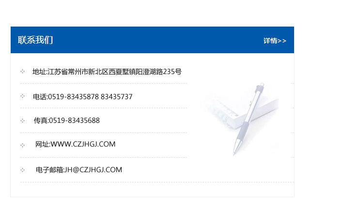 地址:常州市新北區友邦商務大廈1幢16、17層  電話:0519-85101652  傳真:0519-85112595  郵編:213022  網址:www.cz-jiayue_cn.shgukew.com  郵箱:xiajifengaa@163.com